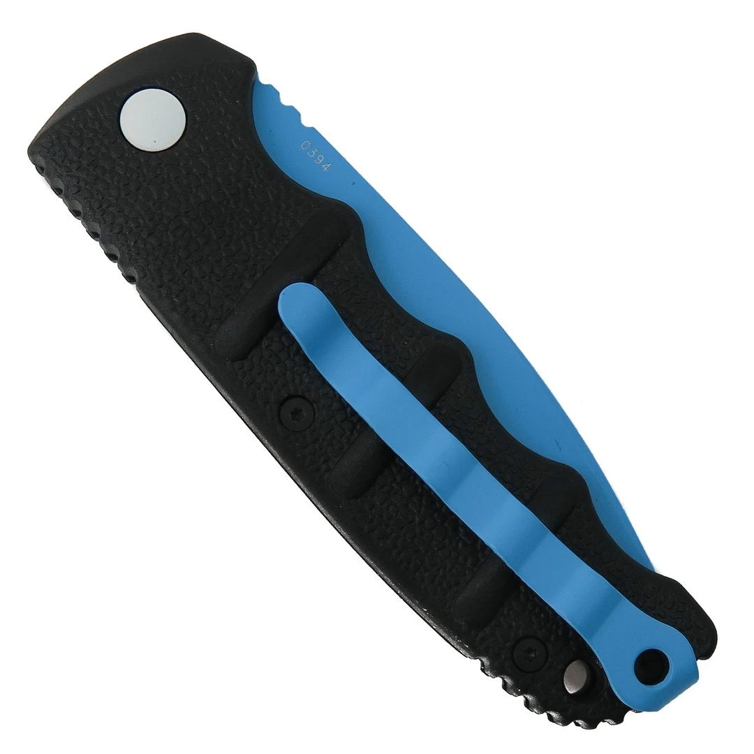 The Boker JM Kalashnikov automatic knife features a Blue finished D2 blade, a classic black handle, and a blue clip along.