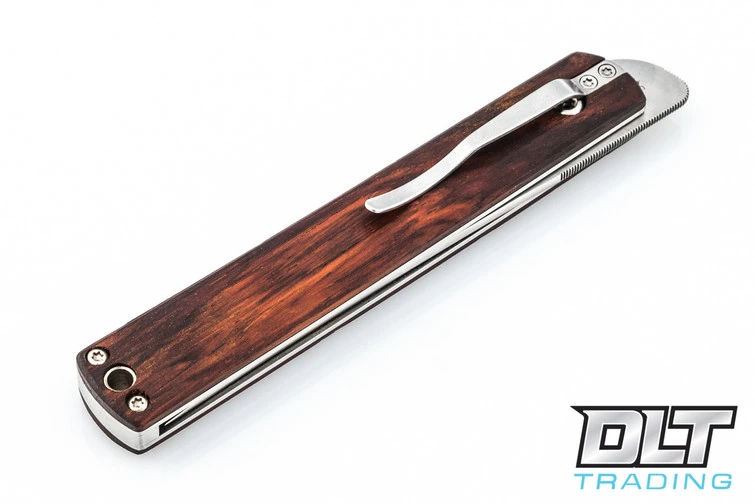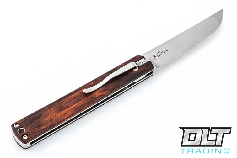 The Japanese Knife Maker Kansei Matsuno is a true master of his trade and his designs certainly show a unique style. From the beginning, we loved the skillful combination of Japanese style elements and features of a modern gentleman’s pocketknife. The slender build and lightweight construction of the Boker Plus Wasabi complement the straightforward design and classic Japanese blade to make an elegant everyday knife. The blade with ball bearings opens with a front flipper and is kept open as a slipjoint with a detent ball. The blade is made of reliable 440C. Handle with stainless liners and milled clip. Scales of cocobolo.