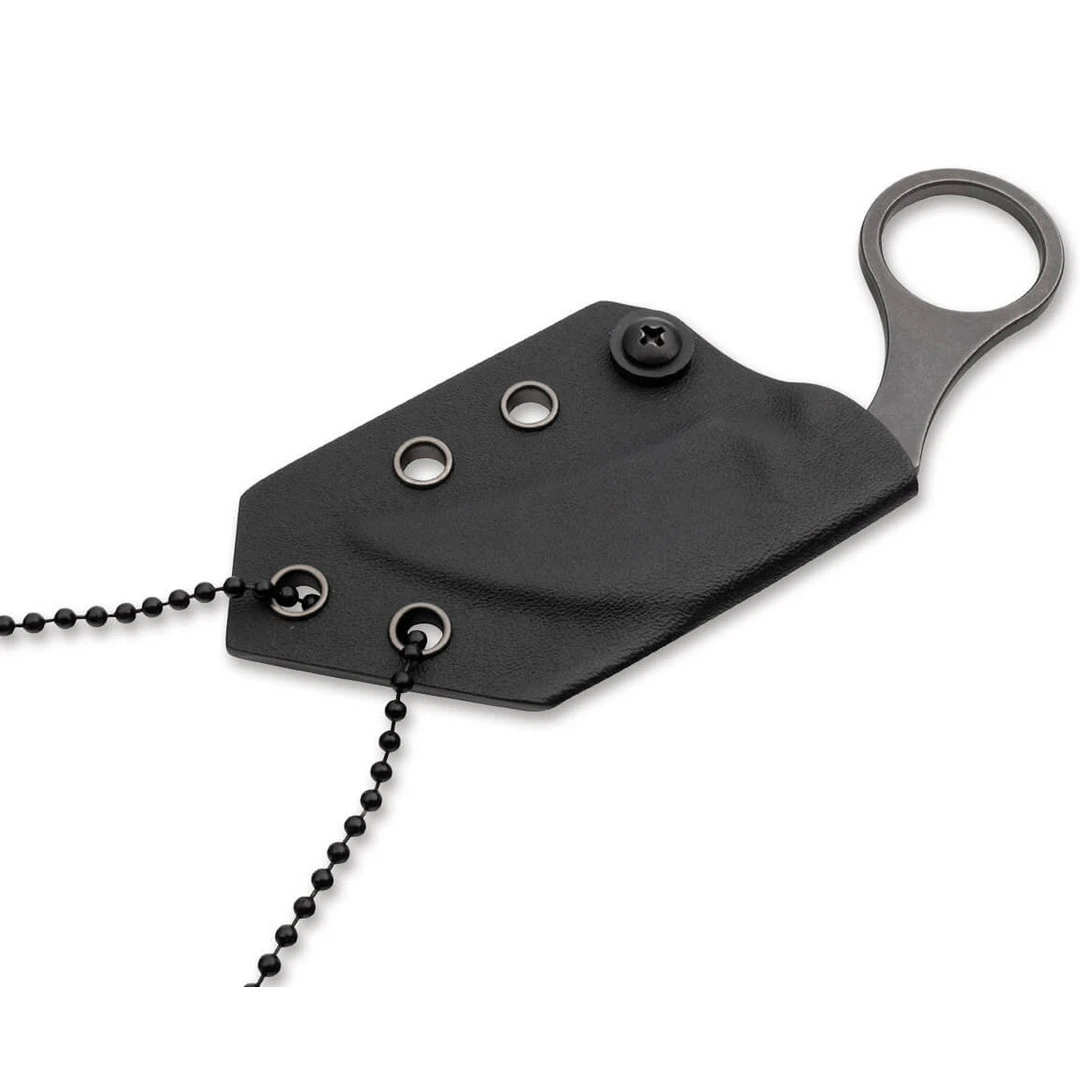 Includes a kydex sheath and a ball chain for use as a neck knife.